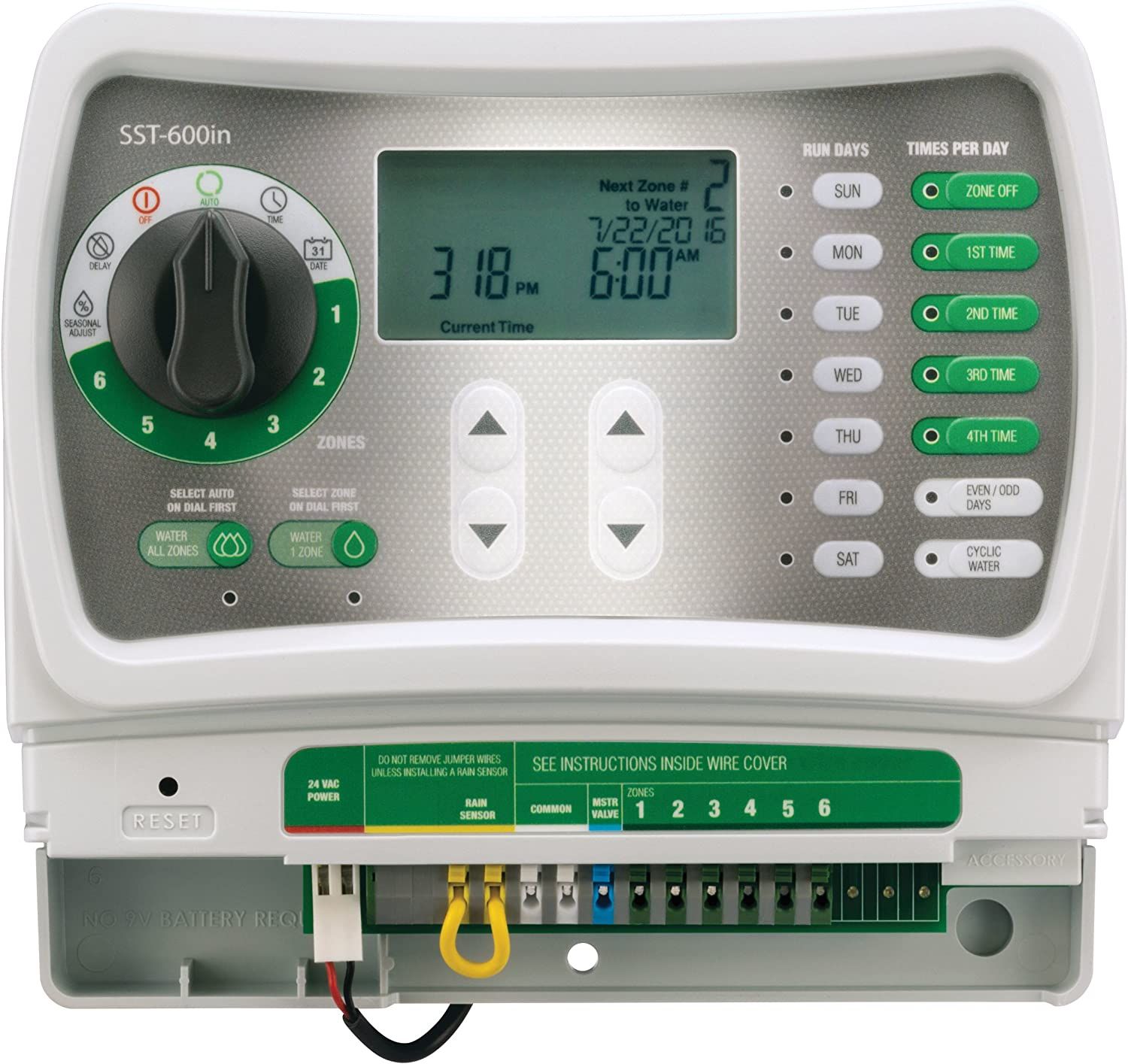 The Rain Bird SST600IN is a 6-zone controller, allowing you to manage multiple garden areas. Whether hydrating your roses or ensuring your vegetables get the perfect water, this timer/controller is up to the task.